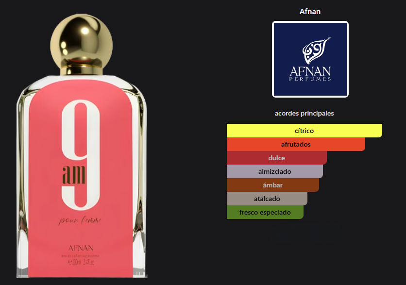 La combinación de notas cítricas y afrutadas en la apertura, seguidas de un corazón dulce y un fondo cálido, hacen de 9AM Pour Femme una fragancia versátil y atractiva para cualquier ocasión.