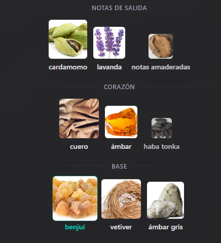 Salida: Cardamomo Lavanda notas amaderadas