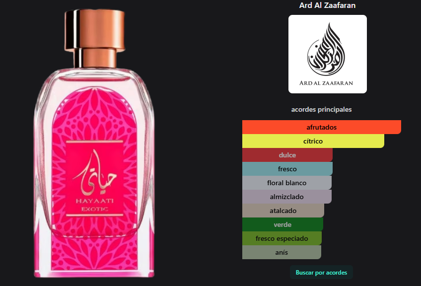 Hayaati Exotic de Ard Al Zaafaran es una fragancia de la familia olfativa para Mujeres. Esta fragrancia es nueva. Hayaati Exotic se lanzó en 2025.