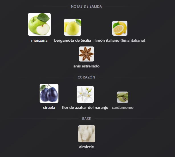 Notas de salida: manzana, bergamota de Sicilia, limón italiano (lima italiana) y anís estrellado
