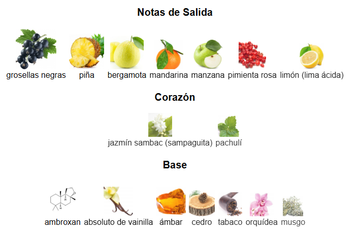 Notas de salida: grosellas negras, piña, bergamota, mandarina, manzana, pimienta rosa y limón (lima ácida)