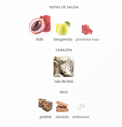 Notas de salida: lichi, bergamota y pimienta rosa.