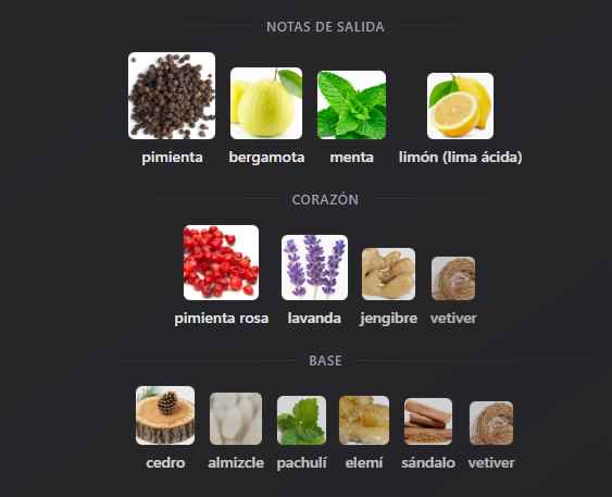 Notas medias: Son vetiver, lavanda, jengibre, pimienta rosa
