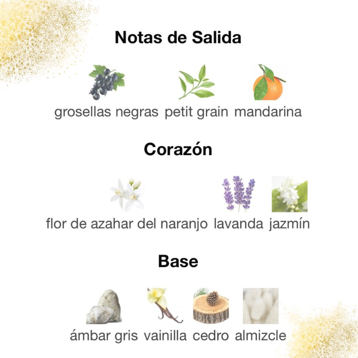 Notas de Corazón: jazmín, flor de azahar del naranjo y lavanda.