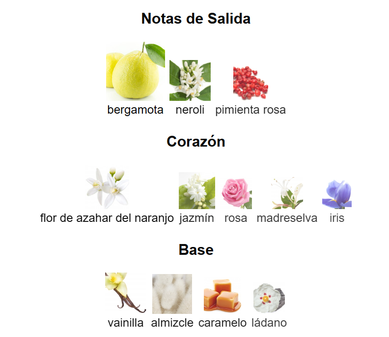 Notas de Corazón: flor de azahar del naranjo, jazmín, rosa, madreselva y iris