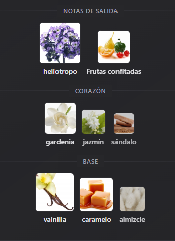 Notas de Fondo: Vainilla, caramelo y almizcle.