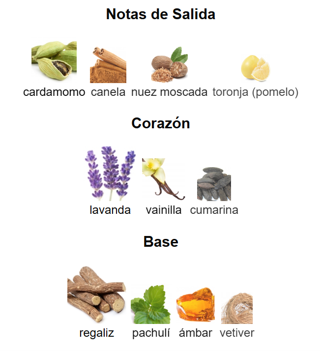 Notas de salida: cardamomo, canela, nuez moscada y toronja (pomelo)