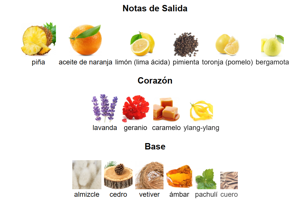 Notas de salida: piña, aceite de naranja, limón (lima ácida), pimienta, toronja (pomelo) y bergamota