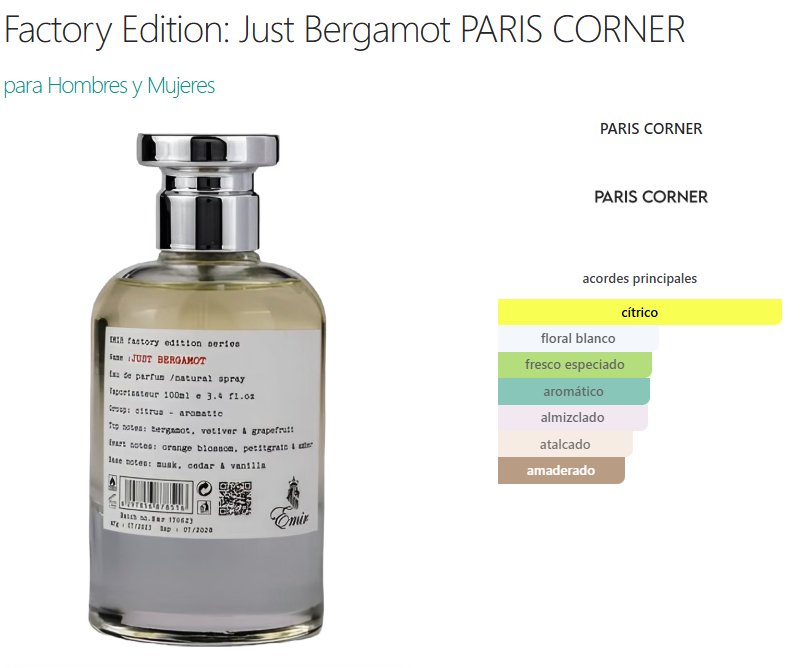 Factory Edition: Just Bergamot de PARIS CORNER es una fragancia de la familia olfativa Cítrica Aromática para Hombres y Mujeres. Factory Edition: Just Bergamot se lanzó en 2021. Las Notas de Salida son bergamota, toronja (pomelo) y vetiver; las Notas de Corazón son flor de azahar del naranjo, petit grain y ámbar; las Notas de Fondo son almizcle, cedro y vainilla..