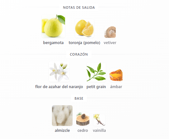 Notas de Corazón: Flor de azahar del naranjo, petit grain y ámbar