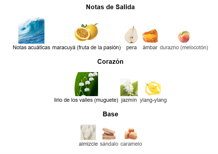 Notas de Salida: Notas acuáticas, maracuyá (fruta de la pasión), pera, ámbar y durazno (melocotón)