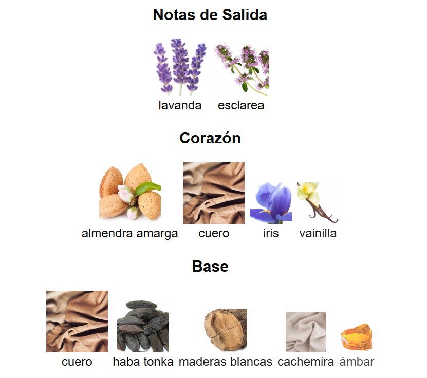 Notas de corazón: almendra amarga, cuero, iris y vainilla