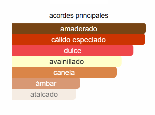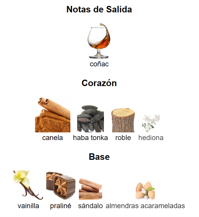 Notas de fondo: ámbar, sándalo, vainilla y praliné