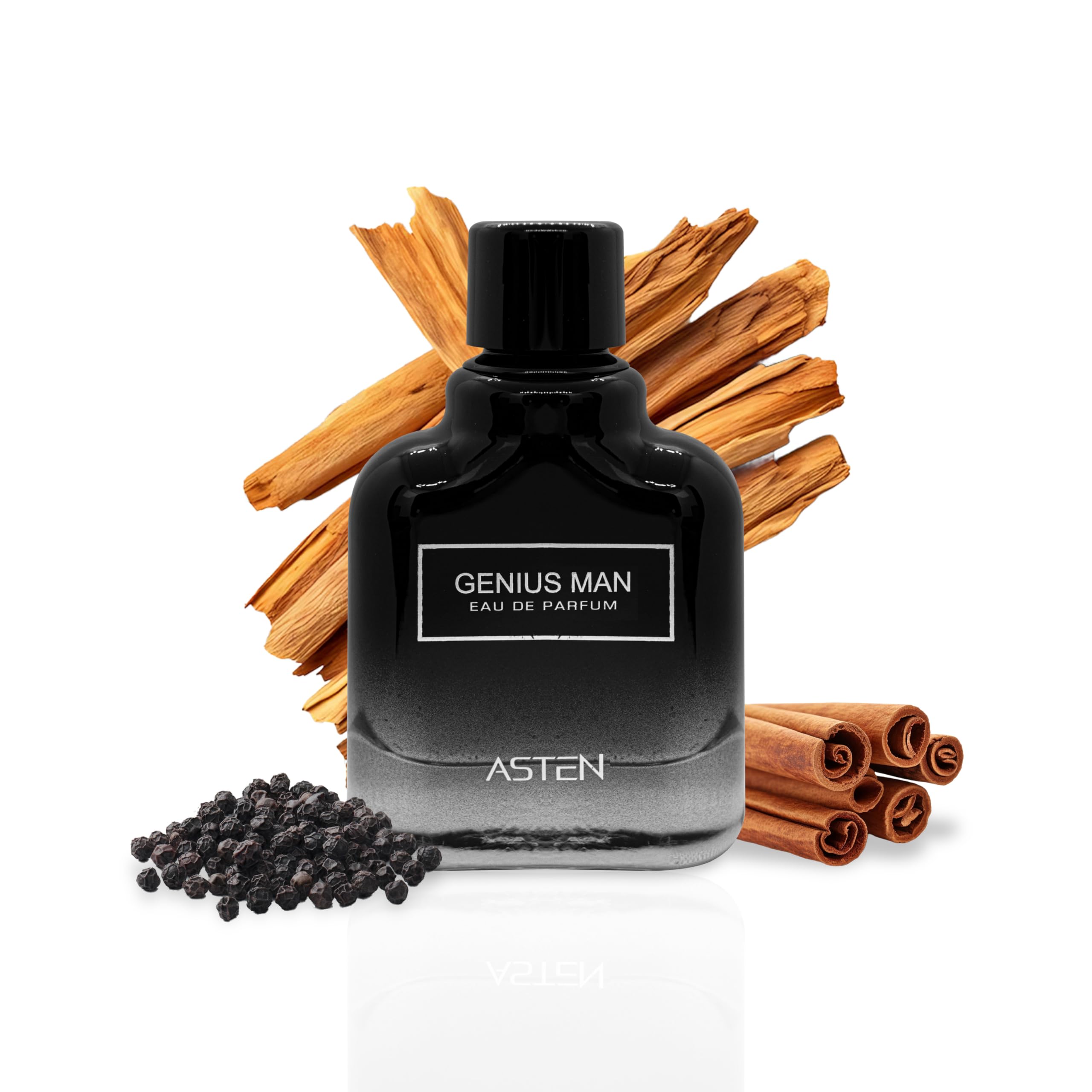 Genius Man Eau de Parfum de Asten, esta fragancia combina la frescura especiada con una profunda base amaderada, ideal para el hombre moderno que expresa elegancia y confianza.