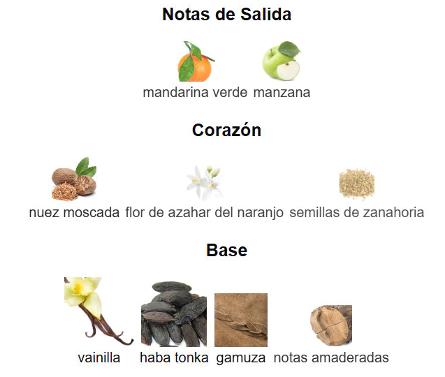 Notas de Corazón: flor de azahar del naranjo, semillas de zanahoria y nuez moscada.