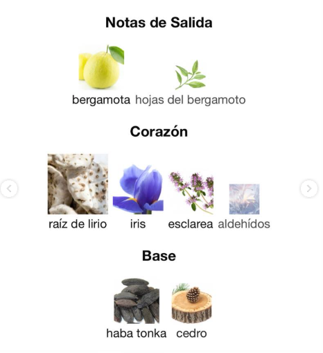 Notas de Corazón: esclarea, raíz de lirio, aldehídos, iris.