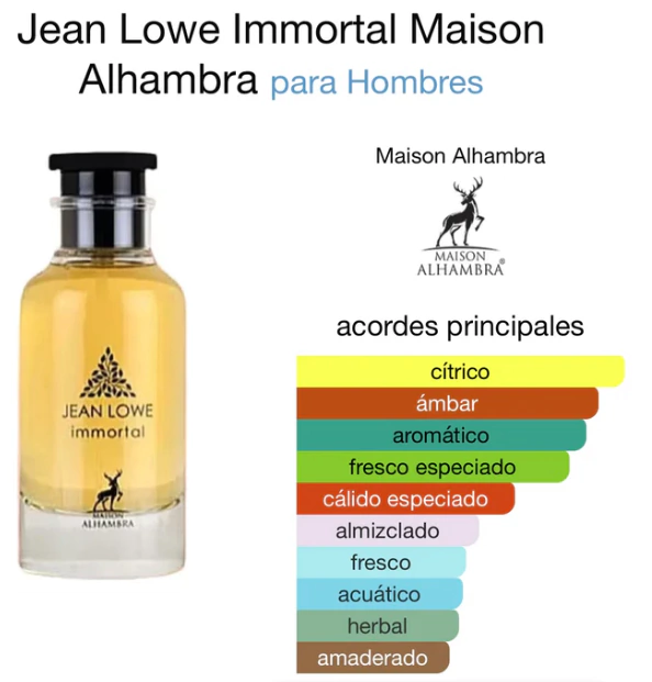 Jean Lowe Immortal de Maison Alhambra es una fragancia de la familia olfativa Oriental para Hombres. Esta fragrancia es nueva. Jean Lowe Immortal se lanzó en 2023.