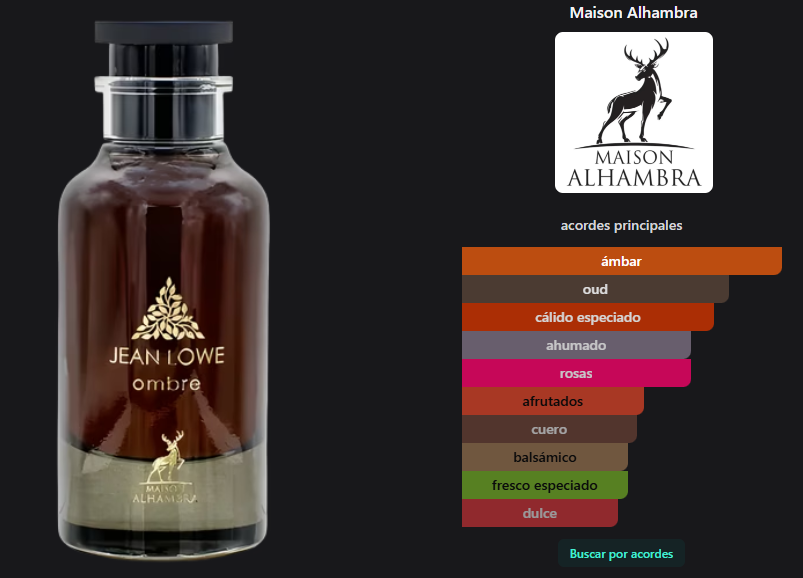 Intenso, oscuro y con una impronta desafiante. Jean Lowe Ombre de Maison Alhambra es una fragancia unisex profunda que combina la fuerza del oud con toques de incienso y especias, creando un carácter enigmático y potente. Su apertura resinoso-ahumada da paso a un corazón floral con rosa y frambuesa que suavizan ligeramente la composición sin restarle fuerza. El fondo ambarado y especiado garantiza un aroma penetrante, duradero y lleno de personalidad, ideal para quienes buscan un perfume imponente y con sello árabe.