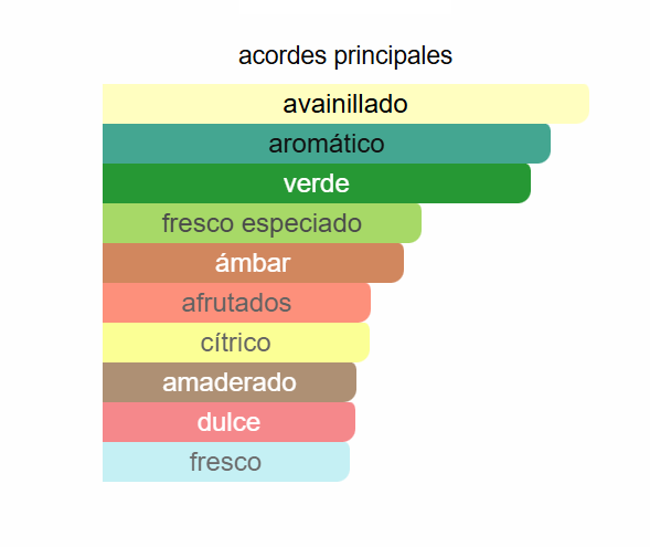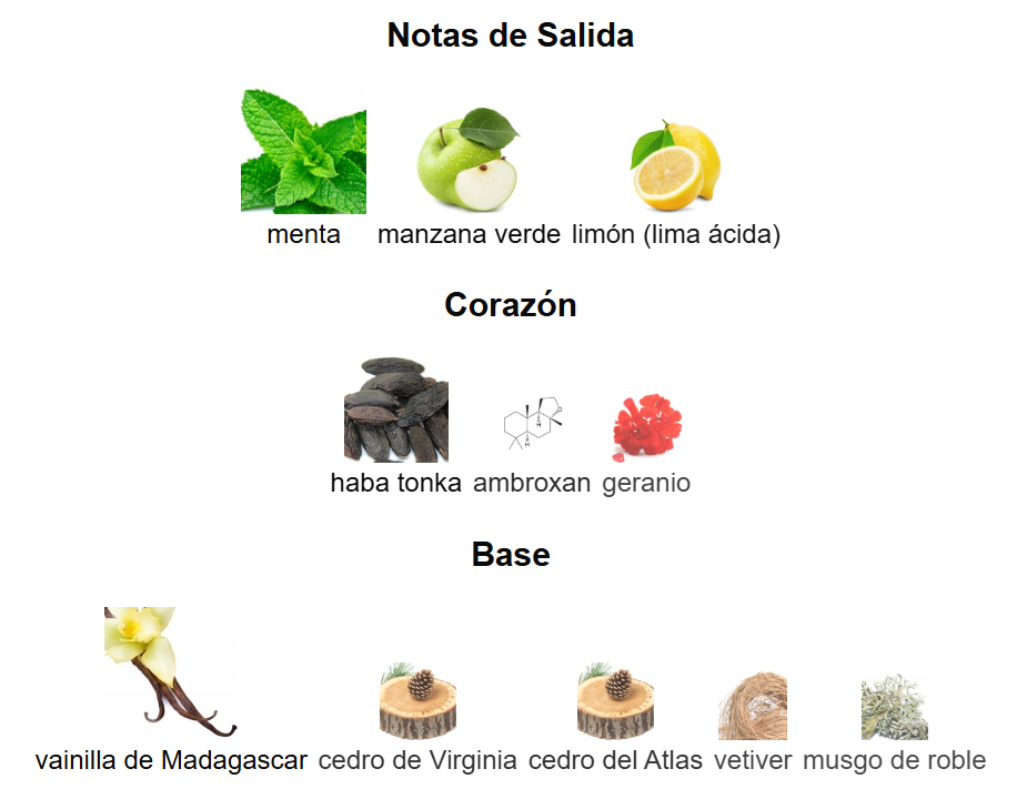 Notas de fondo: vainilla de Madagascar, cedro de Virginia, cedro del Atlas, vetiver y musgo de roble.