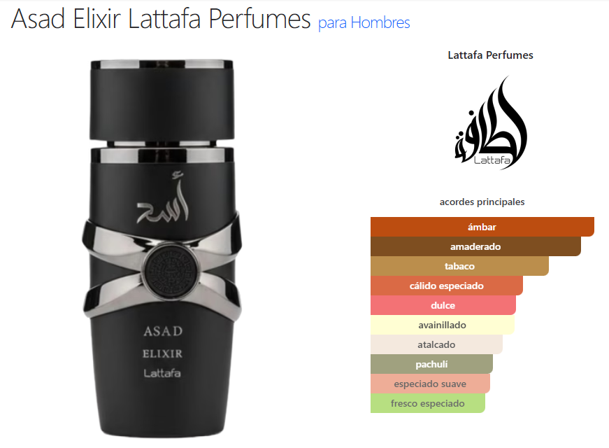 Asad Elixir de Lattafa Perfumes es una fragancia de la familia olfativa Oriental para Hombres. Esta fragrancia es nueva. Asad Elixir se lanzó en 2025.