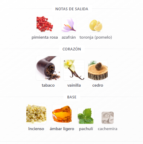 Notas de Base: incienso, ámbar ligero, pachulí y cachemira.