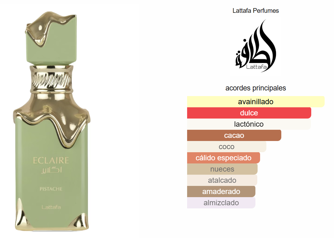 Eclaire Pistache de Lattafa Perfumes es una fragancia de la familia olfativa Oriental Vainilla para Hombres y Mujeres. Esta fragrancia es nueva. Eclaire Pistache se lanzó en 2025. La Nariz detrás de esta fragrancia es Dalia Izem.