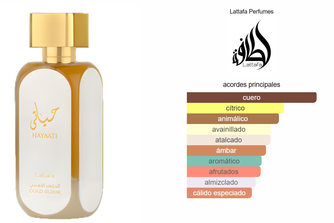 Hayaati Gold Elixir de Lattafa Perfumes es una fragancia de la familia olfativa para Hombres y Mujeres.