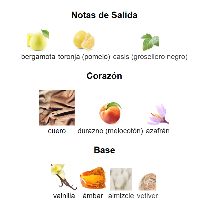 Notas de Corazón: cuero, durazno (melocotón) y azafrán