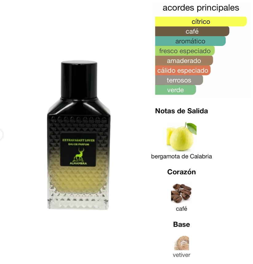 Extravagant Lover de Maison Alhambra es una fragancia unisex que combina el encanto de las flores más sensuales con la calidez envolvente de maderas finas y ámbar. Diseñada para quienes aman destacar con elegancia y magnetismo, esta creación es el reflejo del lujo accesible con una personalidad audaz y sofisticada.