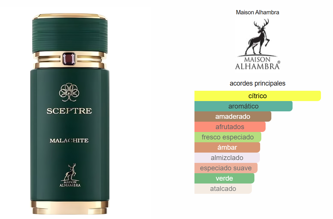 Sceptre Malachite de Maison Alhambra es una fragancia de la familia olfativa Oriental Amaderada para Hombres y Mujeres. Sceptre Malachite se lanzó en 2022.