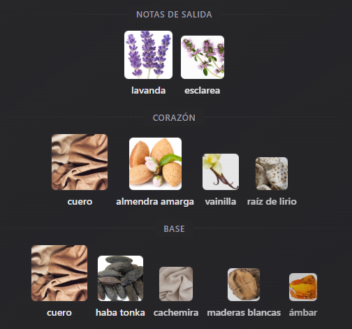 Notas de Fondo : cuero, haba tonka, cachemira, maderas blancas y ámbar.