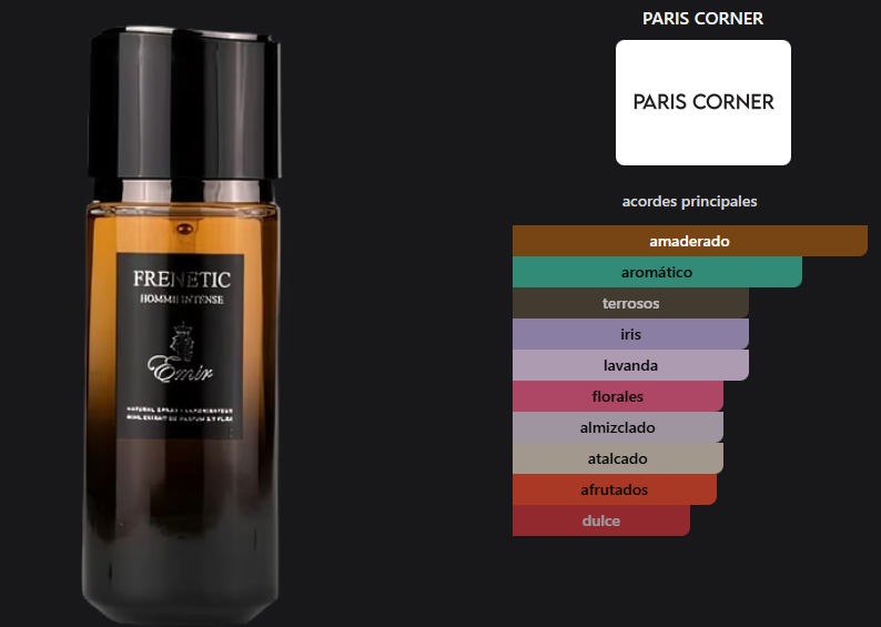 Emir Frenetic Homme Intense de PARIS CORNER es una fragancia de la familia olfativa Almizcle Floral Amaderado para Hombres. Emir Frenetic Homme Intense se lanzó en 2021.