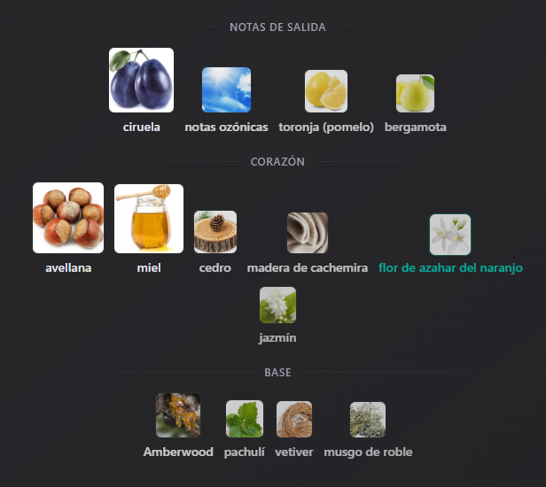 Notas de Salida: Ciruela, notas ozonicas, pomelo y bergamota