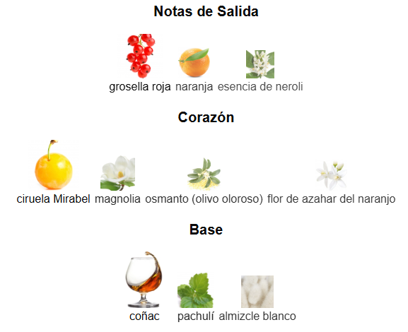 Notas de Corazón: Flor de azahar, Magnolia, Osmanto, Ciruela mirabel.