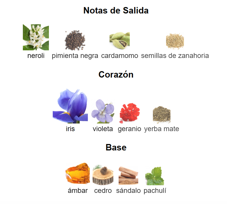 Notas de Salida: Neroli, pimienta negra, cardamomo, semilla de zanahoria