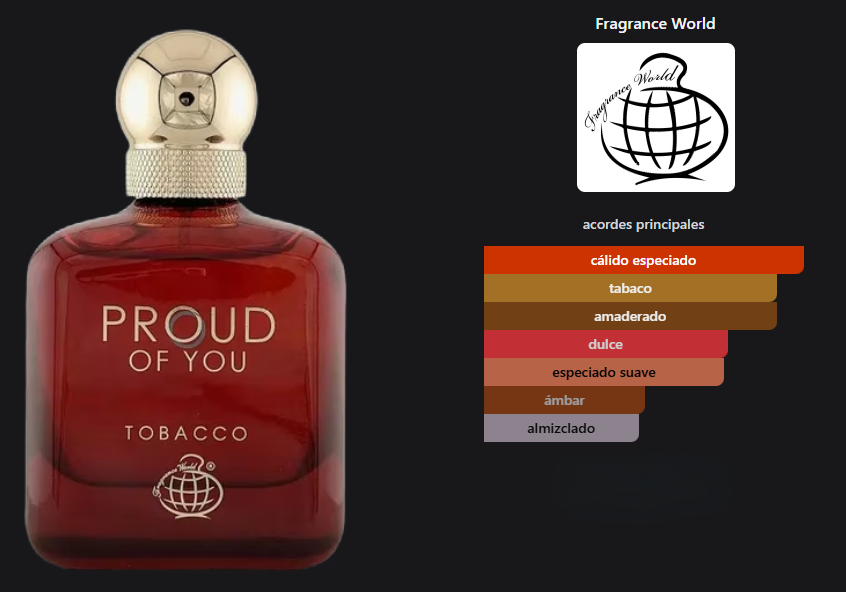 Proud of You Tobacco de Fragrance World es una fragancia de la familia olfativa Aromática Especiada para Hombres. Proud of You Tobacco se lanzó en 2024.