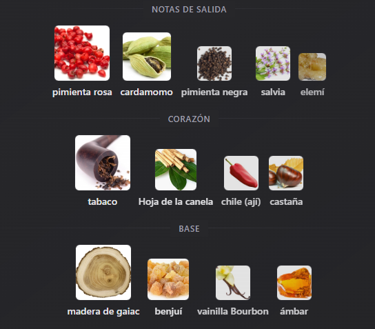 Notas de Corazón: tabaco, Hoja de la canela, chile (ají) y castaña