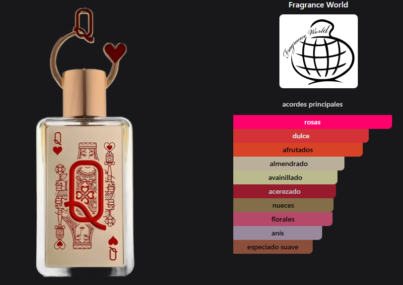 Queen de Fragrance World comienza con una apertura dulce y afrutada gracias a las almendras y cerezas, complementada por la frescura de la bergamota. El corazón floral con diversas variedades de rosas añade un toque romántico y elegante, mientras que la base de iris, vainilla, haba tonka y anís crea un final cremoso y seductor, perfecto para cualquier ocasión especial.