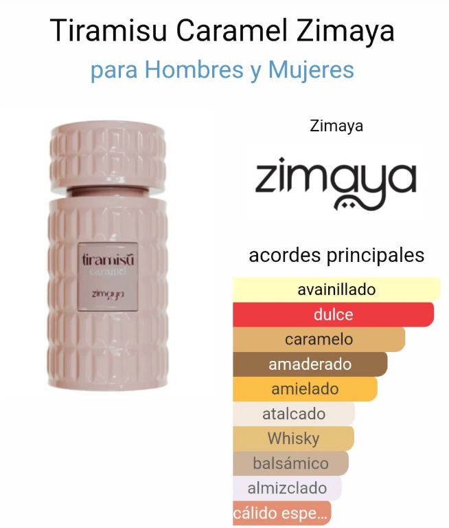 Tiramisu Caramel de Zimaya es una fragancia de la familia olfativa Oriental Vainilla para Hombres y Mujeres, lanzada en 2024 por la casa Zimaya. Esta creación gourmand es una auténtica delicia olfativa, pensada para quienes aman los perfumes dulces, cálidos y envolventes. Su salida se presenta con una nota intensa y adictiva de caramelo fundido, que abre el apetito sensorial desde el primer instante. El corazón aporta un dulzor meloso y cremoso gracias a la miel y la cumarina, mientras que las notas amaderadas equilibran la composición aportando profundidad. En el fondo, una mezcla tentadora de vainilla suave, almizcle cálido y un atrevido toque de whisky dan carácter y sensualidad a esta fragancia deliciosa. Perfecta para climas fríos o para quienes quieren destacar con una estela dulce, acogedora y sofisticada.