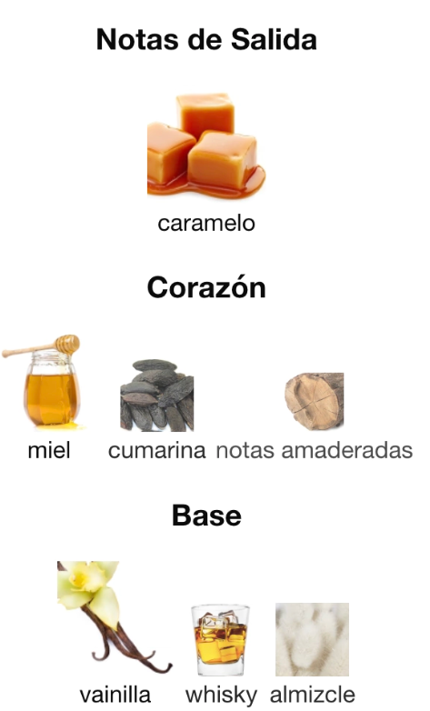 Notas de Corazón: miel, cumarina, notas amaderadas.
